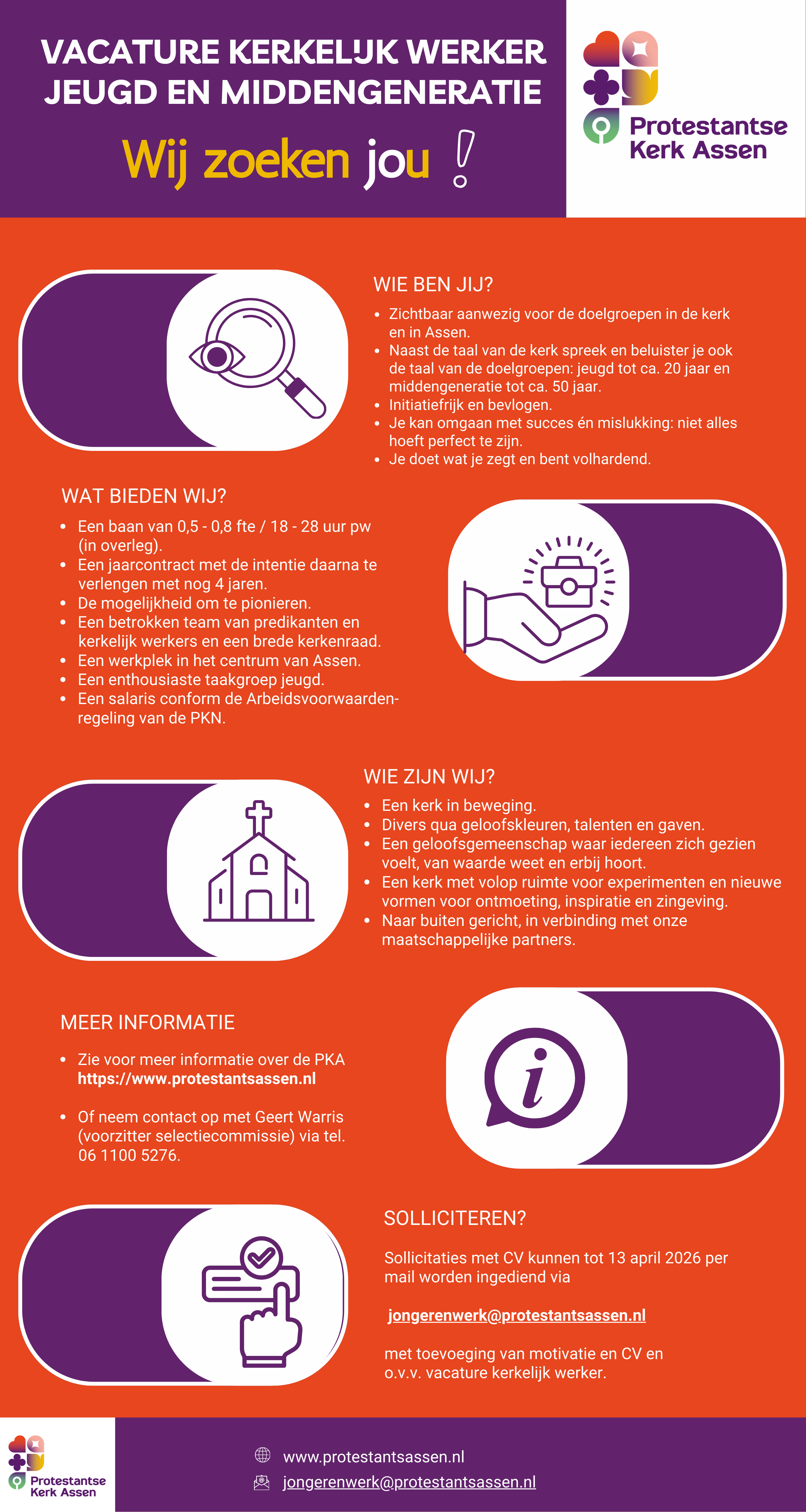 Solliciteren? Mail uw motivatie en CV aan de voorzitter van de selectiecommissie, Geert Warris, via jongerenwerk@protestantsassen.nl